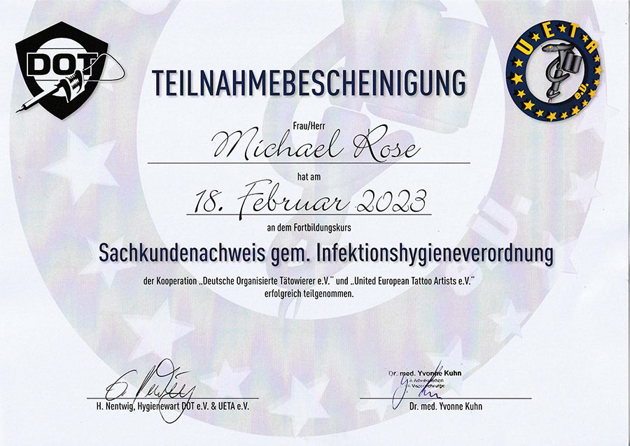 Allergische Reaktionen auf ein Präparat Infektionen durch Verschmutzung oder mechanische Einwirkung (bis zur vollständigen Abheilung!) wie bei jeder anderen Verletzung der Haut auch Vernarbungen durch UV- Bestrahlung oder Kratzen bzw. bei Neigung zur Narbenbildung Hellere Flecken im Tattoo, z.B. durch aufweichen/ Kratzen in der Abheilphase Irritationen der Haut Es ist prinzipiell möglich, dass durch Bestandteile diverser Tätowierfarben ein CT/MRT der tätowierten Körperstelle nicht mehr möglich ist, besonders wenn Metalloxydpigment verwendet wurde. Allerdings ist das äußerst unwahrscheinlich wenn das Tattoo aus einem überprüften Tattoostudio stammt! Die von uns verwendeten Farben entsprechen den aktuellen Gesetzen und Zulassungsbestimmungen, daher sind derartige Reaktionen nicht zu erwarten. Wie eine Schürfwunde ist auch frisch tätowierte Haut eine Eintrittspforte für Pilze und Bakterien, daher das Tattoo nicht unnötig berühren, ausser zur Pflege und das bitte immer nur MIT SAUBEREN HÄNDEN (ansonsten: erhöhtes Infektionsrisiko). Das frische Tattoo auf gar keinen Fall von anderen begrabschen lassen! Man bedenke, wie viele Menschen sich nach dem WC Besuch NICHT die Hände waschen