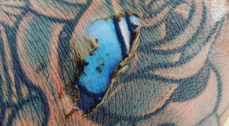 Allgemeines FehldenkenDu denkst das deine Tattoofarben nicht mehr so leuchten wie frisch gestochen oder dein Tattoo verblasst ist? Das ist nicht richtig - wie Du an dem Foto von diesem 20 Jahre alten Tattoo siehst, ist unter der Haut die Farbe frisch und leuchtend wie am 1.Tag. Die beiden darüberliegenden Hautschichten verändern sich im Laufe der Zeit - die Sonne erledigt den Rest und lässt die Haut braun werden. Das Resultat: als ob Du durch Milchglas dein Bild anschaust... es wirkt verblasst. Dazu kommt noch die dunkle Farbe der Haarwurzeln, sobald die Haare über das frische Tattoo nachwachsen. Aus diesem Grunde sieht weisse Farbe auch nach einiger Zeit bräunlich oder ist gar nicht mehr zu sehen.